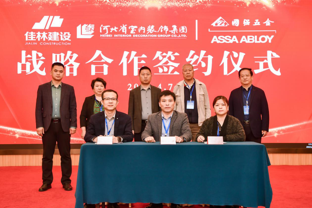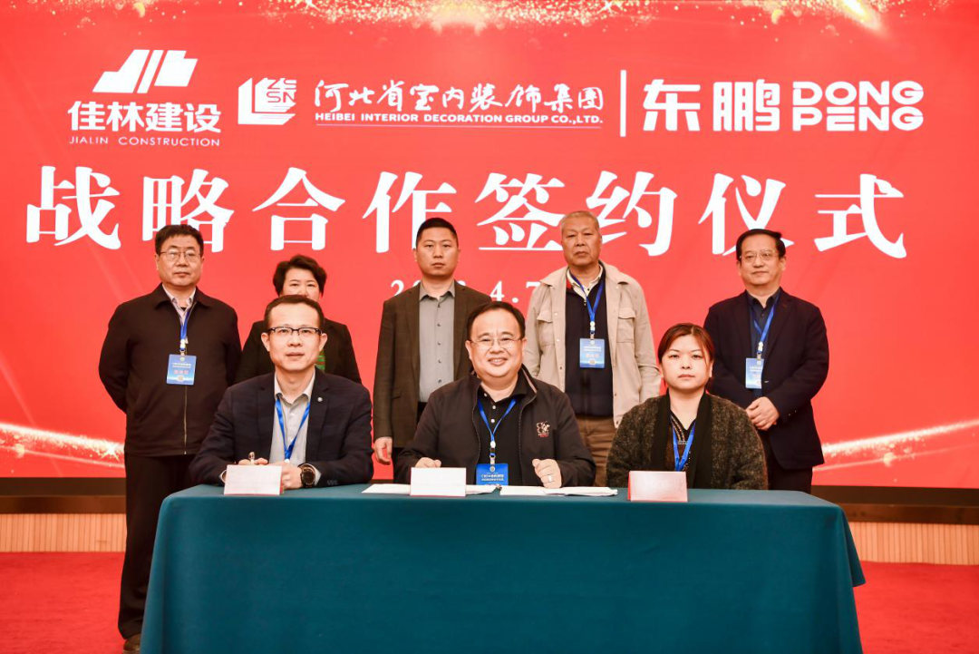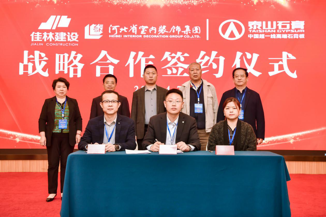 在中国建筑装饰协会绿色智慧建造分会和河北省建筑装饰业协会等多位领导的见证下,佳林建设分别与泰山石膏、东鹏控股、国强五金签署战略合作。